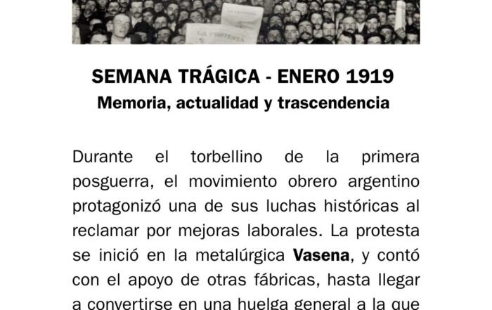 SEMANA TRÁGICA - ENERO 1919 Memoria, actualidad y trascendenciaDurante el torbellino de la primera posguerra, el movimiento obrero argentino protagonizó una de sus luchas históricas al reclamar por mejoras laborales. La protesta se inició en la metalúrgica Vasena, y [...]