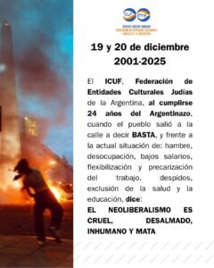 El ICUF, Federación de Entidades Culturales Judías de la Argentina, al cumplirse 24 años del Argentinazo, cuando el pueblo salió a la calle a decir BASTA, y frente a la actual situación de: hambre, desocupación, bajos salarios, flexibilización y precarización del trabajo, despidos, exclusión de la salud y la educación, dice: