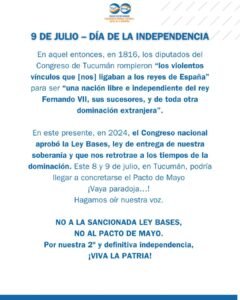 En este presente, en 2024, el Congreso nacional aprobó la Ley Bases, una ley que entrega nuestra soberanía y nos retrotrae a los tiempos de la dominación. Este 8 y 9 de julio, en Tucumán, podría concretarse el Pacto de Mayo. ¡Vaya paradoja!