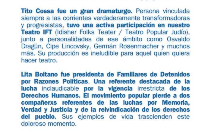 Fallecieron Tito Cossa y Lita Boitano, ambos referentes indiscutidos de las luchas democráticas y popularesTito Cossa fue un gran dramaturgo. Persona vinculada [...]
