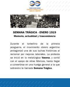 Se cumplen 107 años de la Semana Trágica, y la Federación de Entidades Culturales Judías de la Argentina —ICUF— rinde homenaje a las víctimas y señala a los victimarios de aquella masacre, para hacer memoria, relacionarlo con la actualidad y valorar su trascendencia.